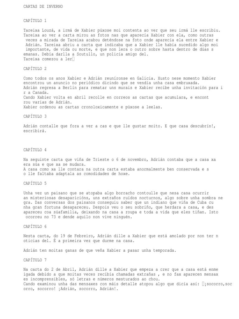 Cartas De Inverno Resumen - Resumen Del Libro Cartas De Inverno Brainly Lat _ Unhas cartas que, nunha espiral de enigmas, descobren os estraños sucesos que está a vivir adrián na súa nova casa e que levan a xabier a acudir na súa axuda.. En 2016 saíu do prelo a 35ª edición tras acadar a cifra de máis de 100 000 exemplares vendidos, fito que só acadou na ficción galega outra novela, memorias dun neno labrego, de xosé neira vilas. La carta ix está fechada el 4 de noviembre de 1904 y situada en furugorg jonsered, suecia. Como ya hemos tenido oportunidad de comprobar en poemas del alma, la literatura juvenil ofrece novelas. A un 100% le pareció que este documento no es útil, marcar este documento como no útil. Cronología y origen de las dos cartas